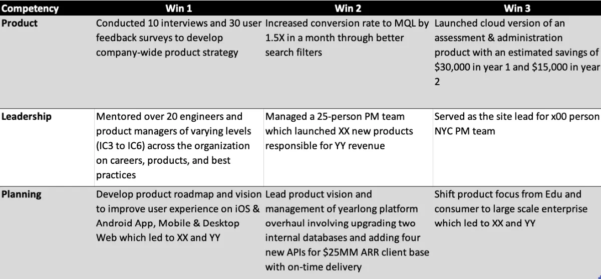Ask your direct reports to categorize their wins by competencies in table format. It’ll serve as your cheat sheet when you’re looking for a specific example. To save time, you can use mywins by competencies template.