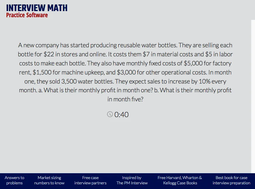 Amazon.com named Interview Math the #1 selling case interview math prep book. To help our readers master case interview math further, Jack Hyder, along with Daanish Khazi, created Interview Math Practice Software. Now you can practice Interview Math questions on your own. You can time yourself and answer questions faster.