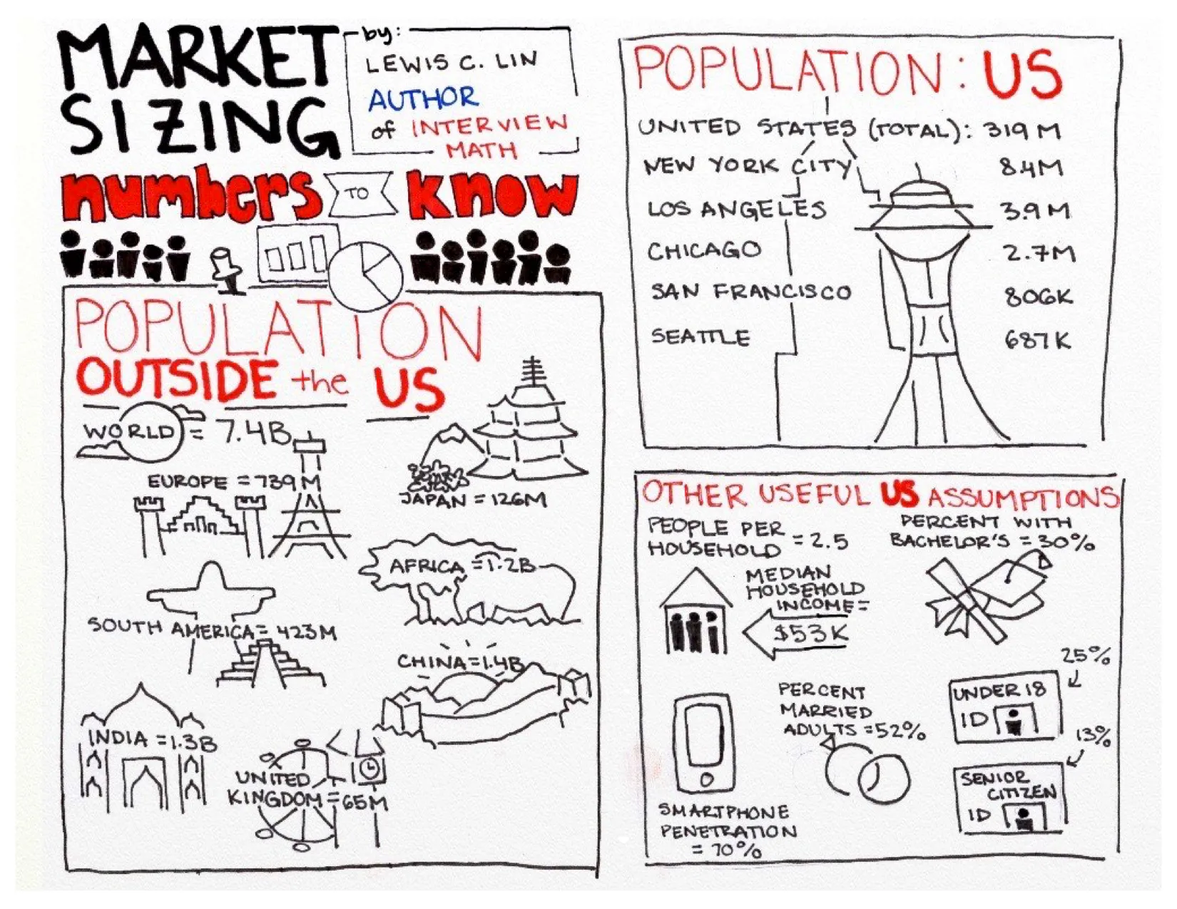 Next, Interview Math readers have loved our market sizing numbers to know cheat sheet. Katie, on my team, created a beautiful sketchnote version.