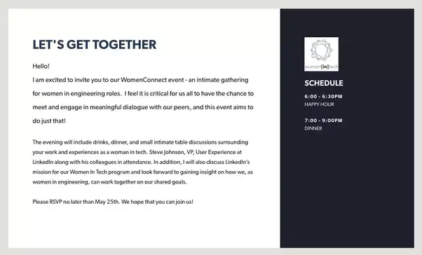 - Exclusive events. LinkedIn invited female engineers to attend a networking event with LinkedIn’s top engineering executives. Dinner included.