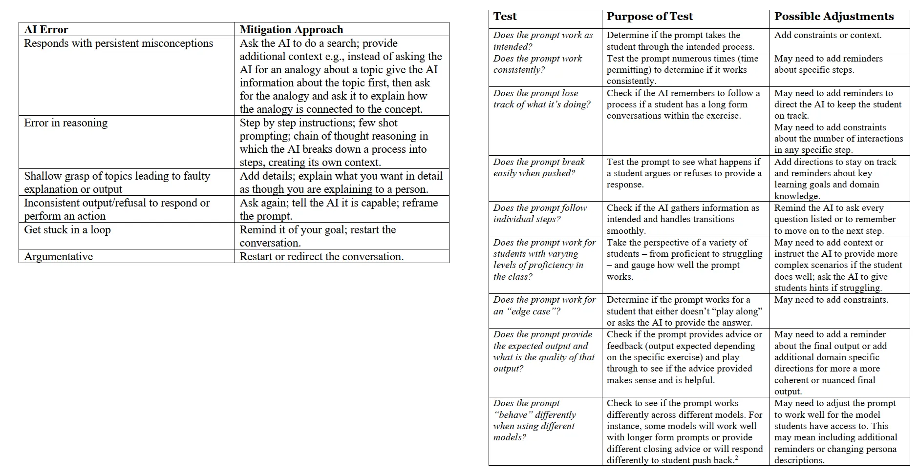 Once you’ve diagnosed the issue, refer to the “Mitigation Approach” column for suggested strategies to resolve it. For example, if your AI is responding with misconceptions, the recommendation is to provide additional context upfront instead of prompting for analogies first.