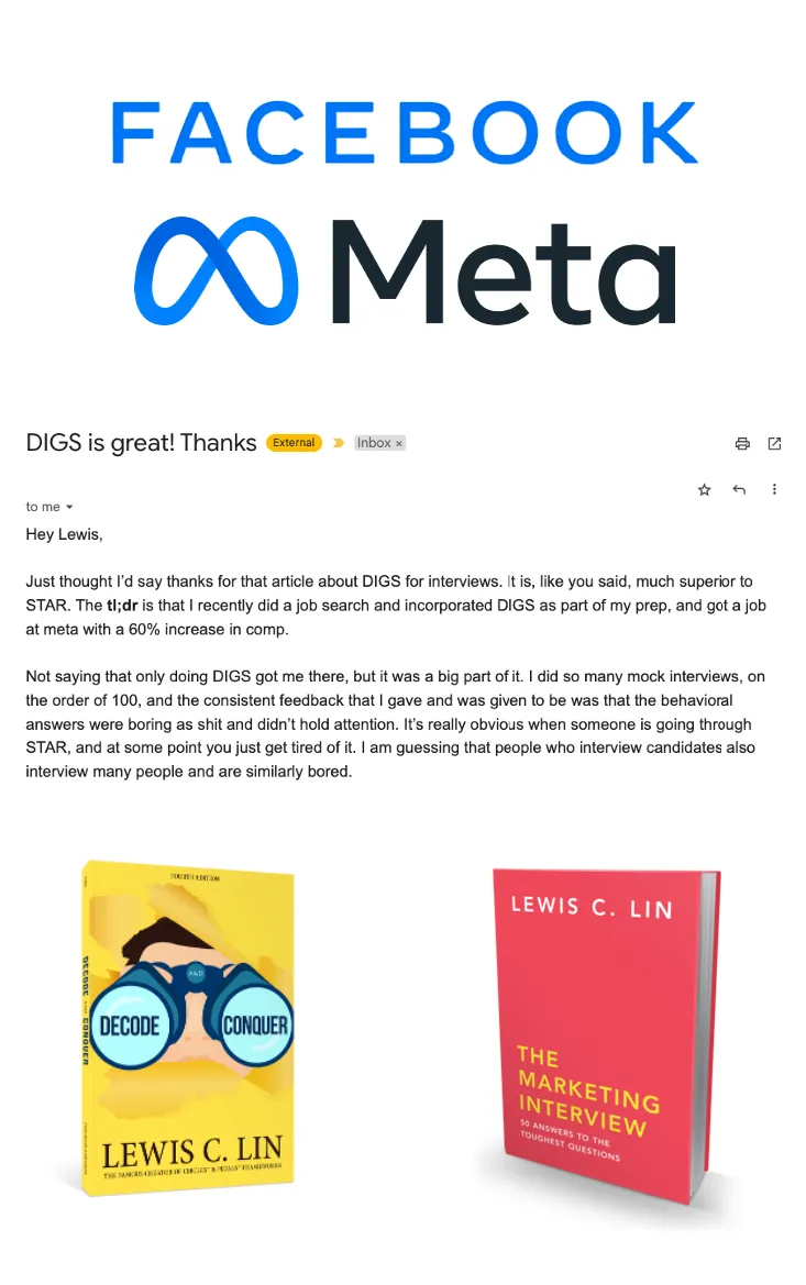 The result? John received a job offer from Meta, which led to a 60% increase in compensation compared to his previous role. He credits the DIGS method for helping him stand out from other candidates and secure the position.