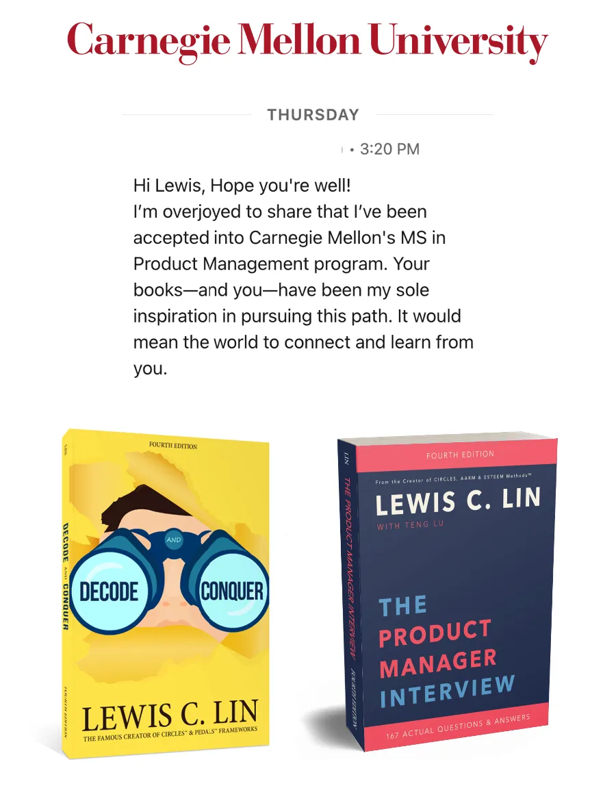 I’m honored that my books, especially “Decode and Conquer,” have inspired the next generation of product management aspirants. A reader recently shared that she’s been accepted into Carnegie Mellon’s MS in Product Management program!