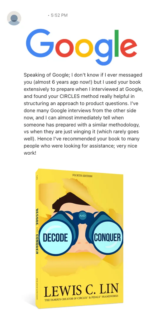 Stepping into the world of landing a job at Google is like embarking on an epic quest, and Decode and Conquer and CIRCLES is your trusty sword on this journey. Authored by yours truly, this book is your key to unlocking the mysteries of Google’s challenging interview process. It’s not just a book; it’s your personalized roadmap to conquering the Everest of job hunts.