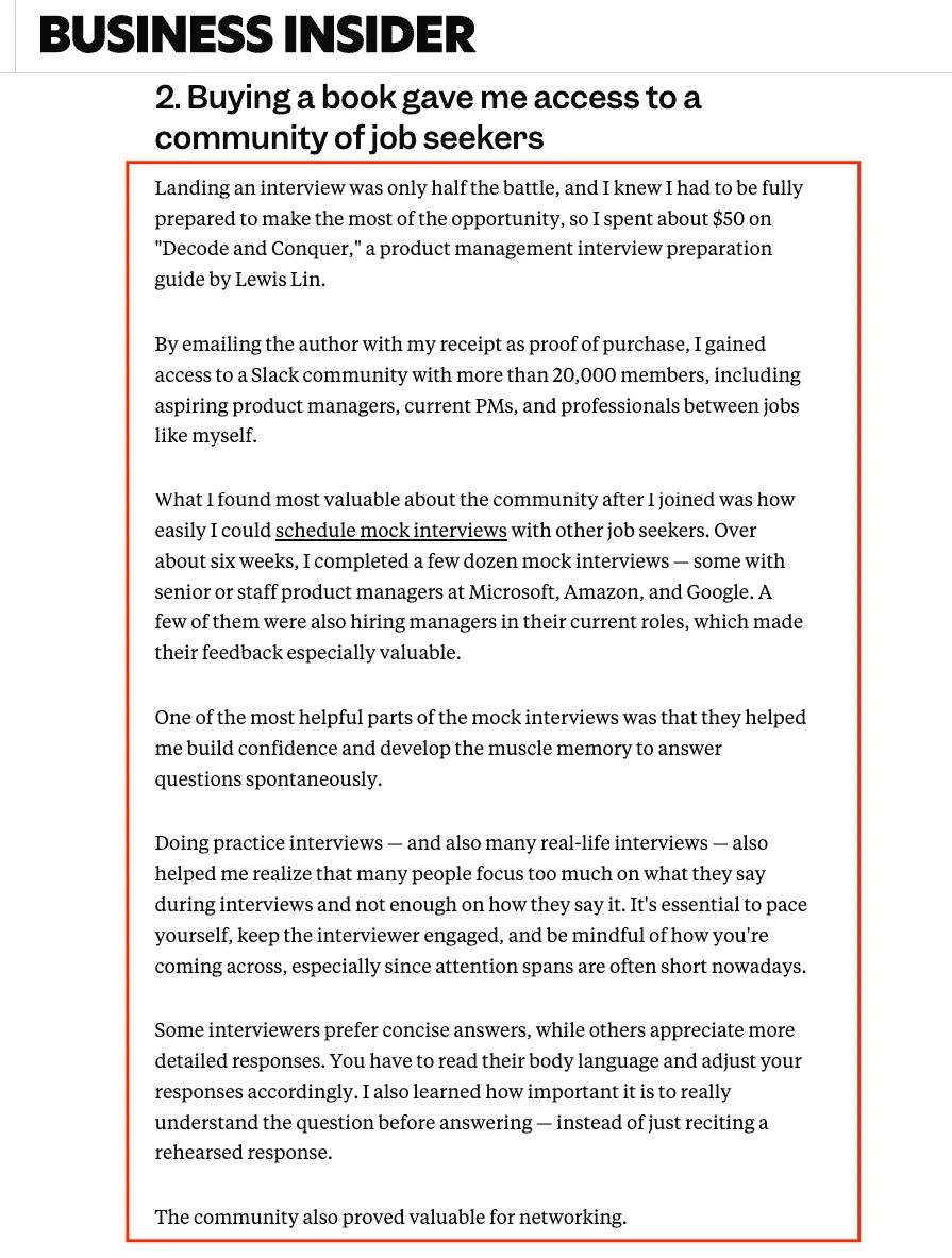 Over six weeks, Aman completed dozens of mock interviews through the Lewis Lin Slack Community—practicing with senior and staff PMs from Microsoft, Amazon, and Google. Some were hiring managers.