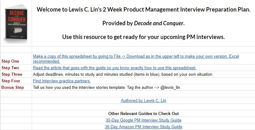 It also includes links to my two company specific guides: a 30-day study guide for Google PM interviews and a 30-day study guide for Amazon PM interviews. (I do have a 30-day study guide for Facebook PM interviews, in my book The Product Manager interview.)
