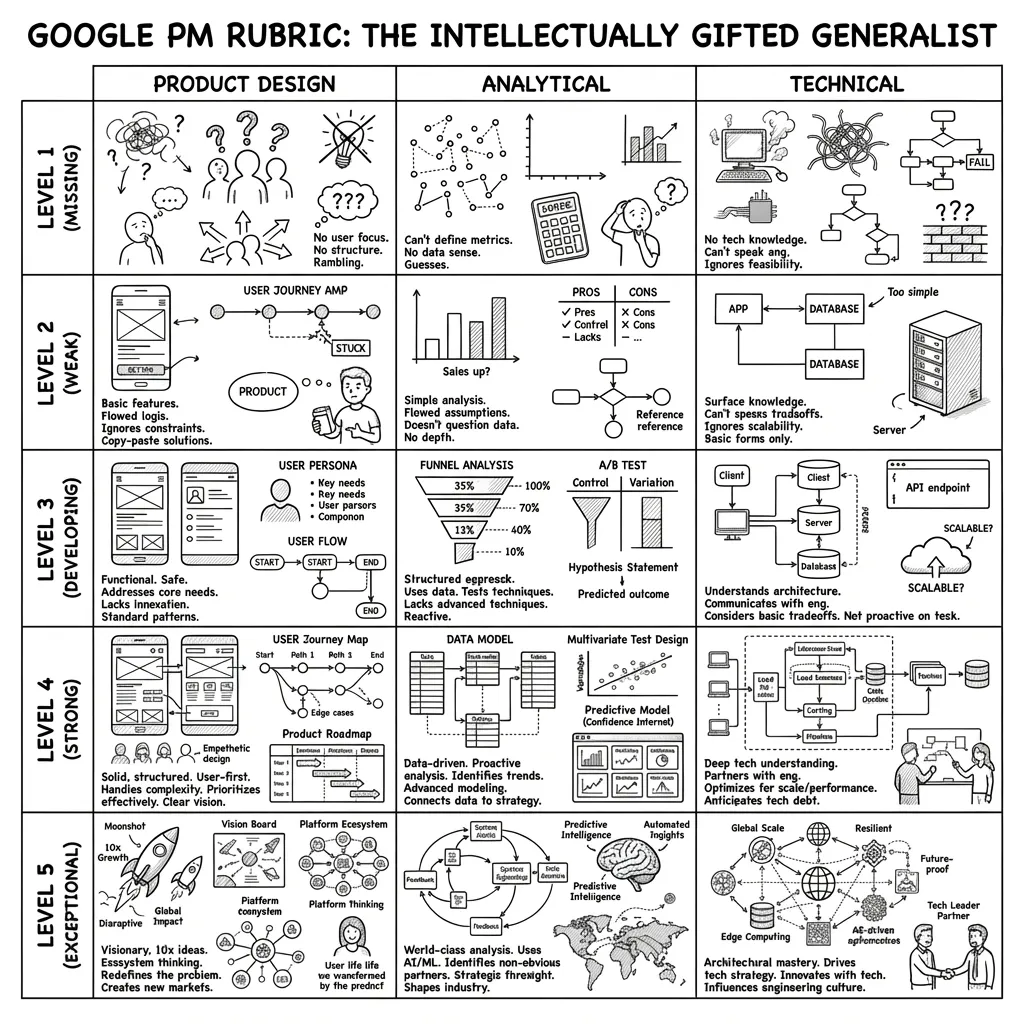 Google PM interviews aren’t pass/fail. There are five distinct performance levels across three competencies: Product Design, Analytical Thinking, and Technical Depth.