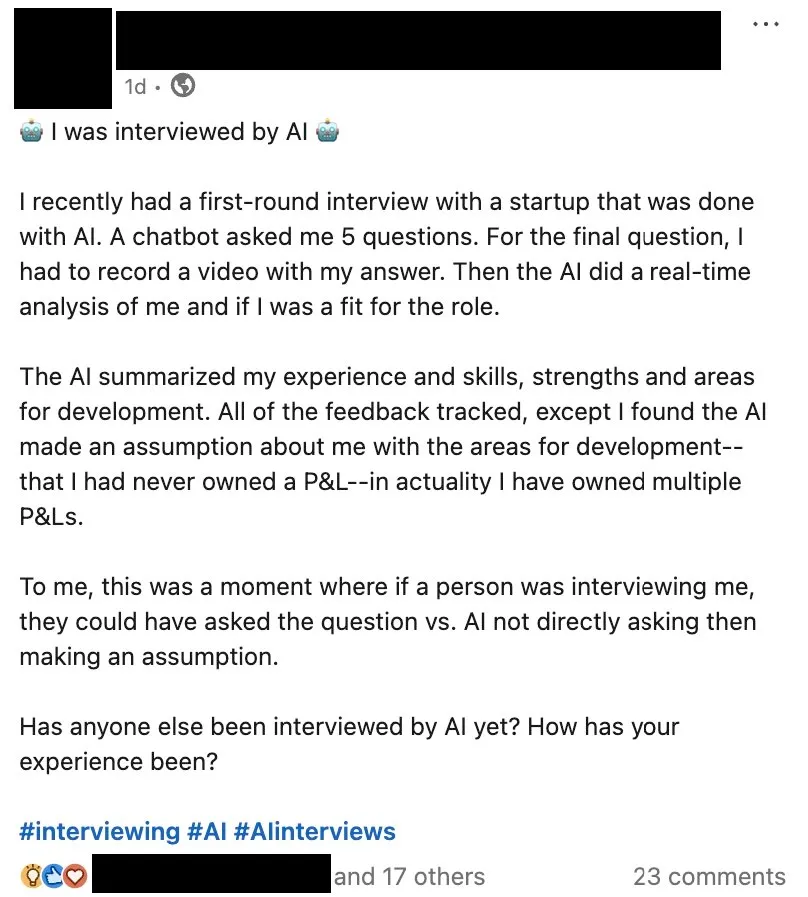 The AI conducted the entire first-round screening, analyzing responses and providing real-time feedback on the candidate’s fit for the role. According to the post, much of the AI’s assessment was accurate - evaluating the candidate’s skills and experience relative to the position requirements.