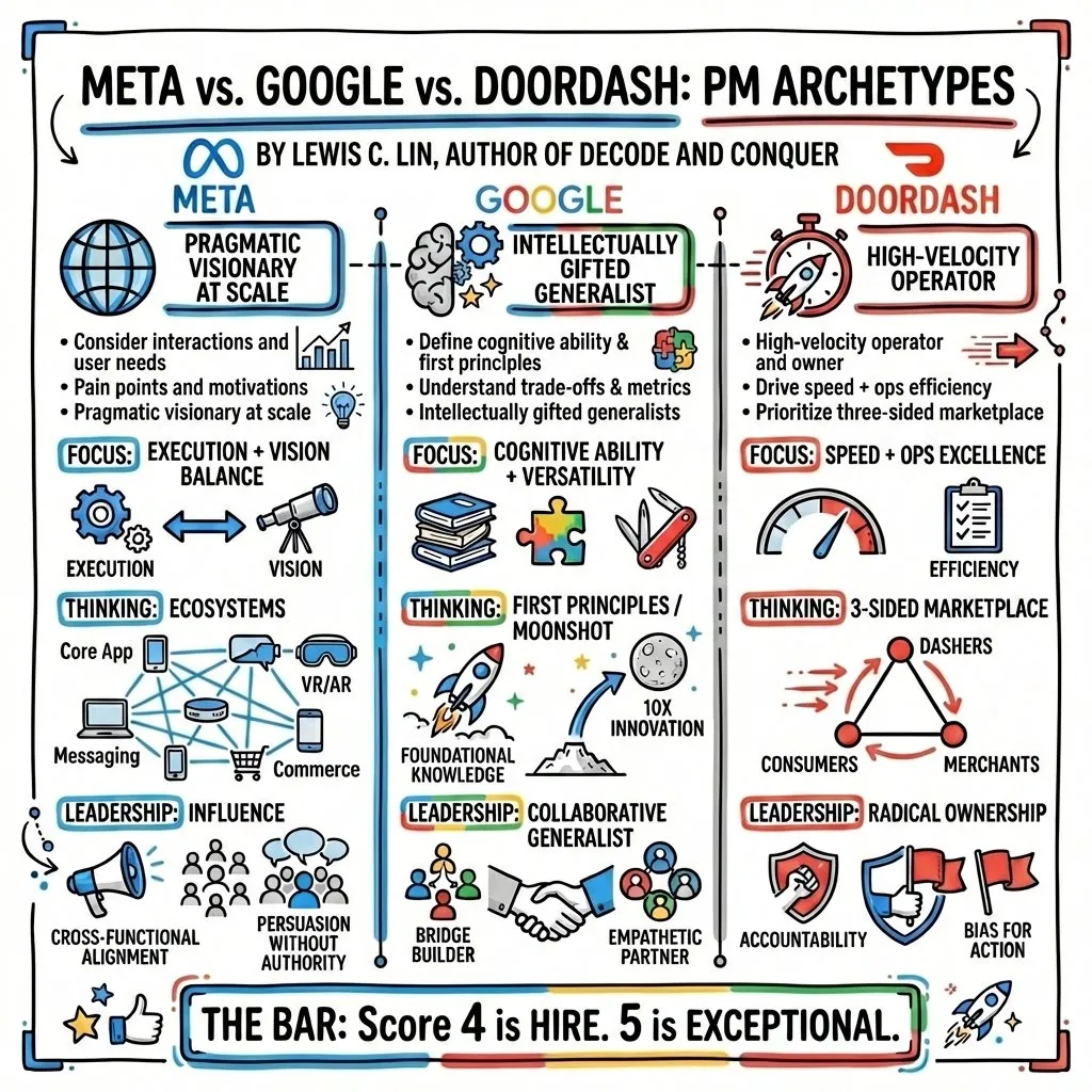 Meta hires Pragmatic Visionaries who influence without authority. You’re connecting messaging, commerce, and VR like a conductor leading an orchestra you don’t actually control. Google hunts for Intellectually Gifted Generalists who can match wits with the smartest engineers in the room. Show up without first principles and defensible metrics? You’ll get eviscerated politely. DoorDash forges High-Velocity Operators who treat speed like oxygen. You’re not tweaking features—you’re balancing a three-legged stool where dashers, consumers, and merchants are all moving, and if one leg breaks, the whole thing crashes.